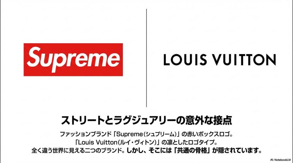 突然ですが、ファッションブランド「Supreme」の赤いボックスロゴと、「Louis Vuitton」の凛としたロゴを思い浮かべてみてください。