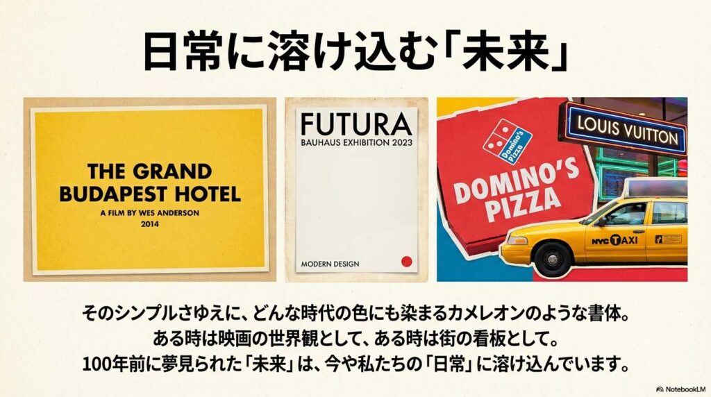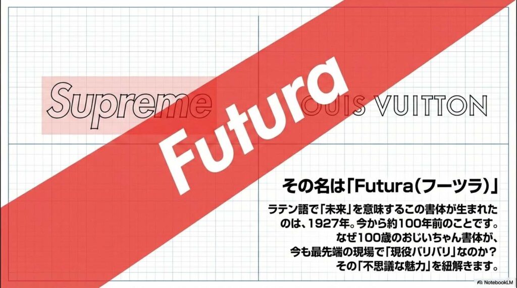 驚くべきことに、ラテン語で「未来」を意味するこの書体は、今から約100年前の1927年に生まれました。100年前のおじいちゃん書体が、なぜ今も最先端のストリートブランドやハイブランドで「現役バリバリ」でいられるのでしょうか。