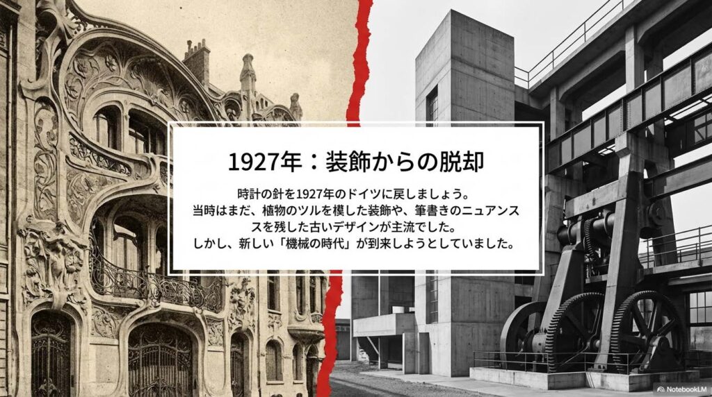 Futuraが誕生した1927年のドイツは、デザインの大きな転換期でした。当時主流だったのは、植物のツルを模したような華美な装飾を持つフォントや、手書きの風合いを残した古い書体です。