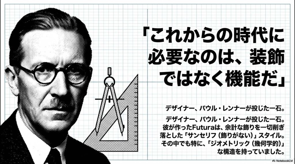 彼が生み出したFuturaは、一切の装飾を排した「ジオメトリック・サンセリフ(幾何学的な、飾りのない書体)」です。