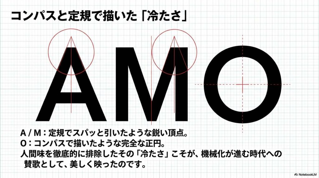 例えば、アルファベットの「O」はコンパスで描いたような完全な円に見え、「A」や「M」の頂点は定規で引いたように鋭く尖っています。