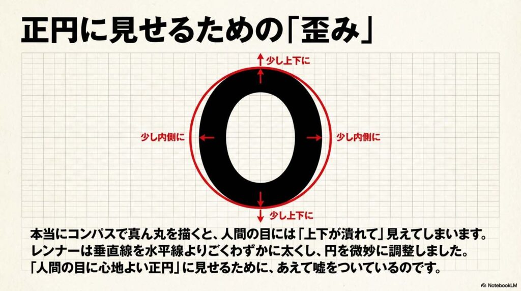 もし、数学的に完全な円をそのまま文字として使うと、人間の目には上下が少し潰れたように見え、歪んで感じられてしまいます。この視覚的な問題を解決するため、デザイナーのレンナーは意図的な「嘘」をつきました。