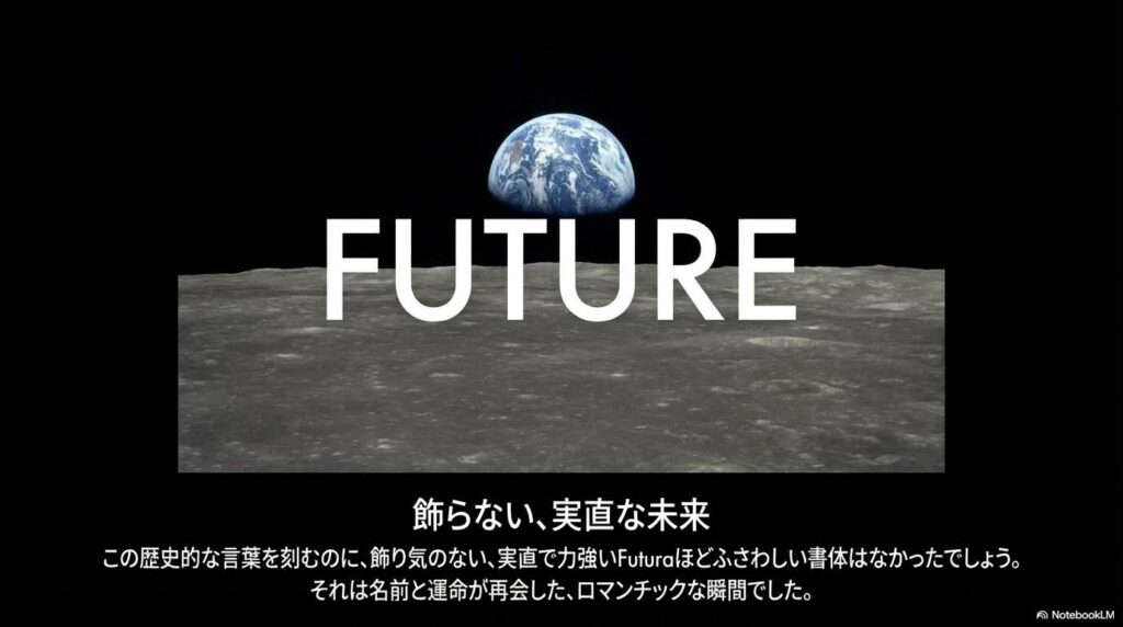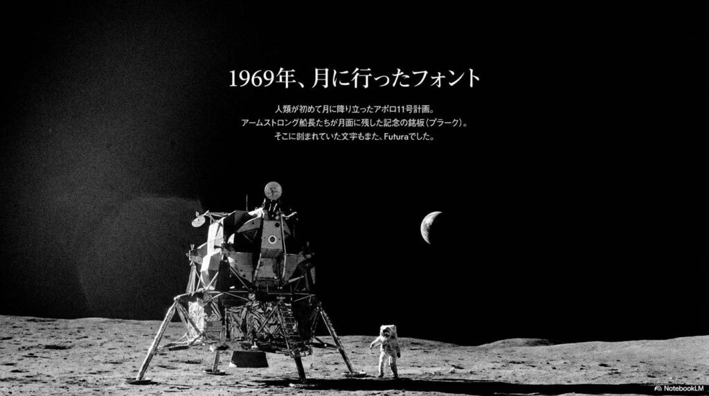 1969年、アポロ11号計画によって人類が初めて月面に降り立った歴史的な瞬間。宇宙飛行士たちが月に残した記念の銘板(プラーク)に刻まれた文字は、何を隠そう、このFuturaでした。