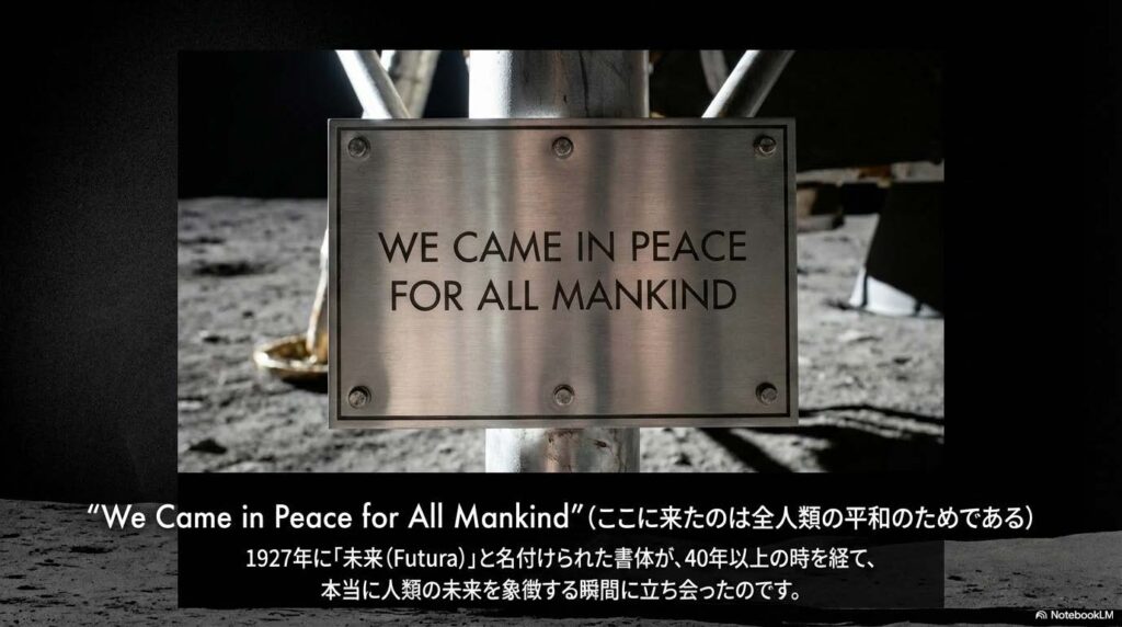 1927年に「未来」と名付けられた書体が、40年以上の時を経て、まさに人類の未来を切り拓く瞬間に立ち会ったのです。こんなにロマンチックな話、そうそうありませんよね。銘板には、次のようなメッセージが刻まれていました。