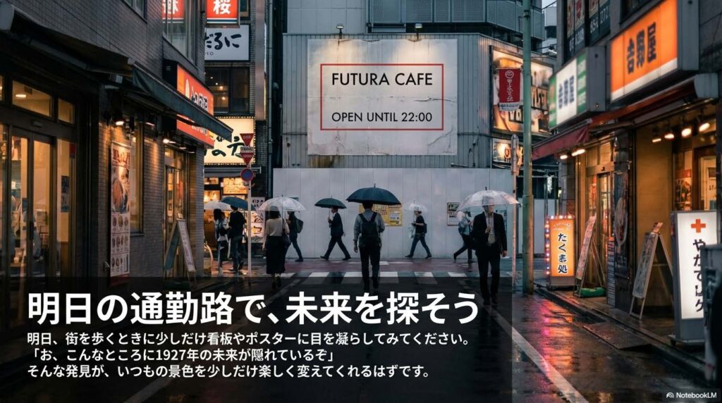 明日、街を歩くときには、ぜひ看板やポスターに少しだけ目を凝らしてみてください。「お、こんなところに1927年の未来が隠れているぞ」そんな発見ができたら、いつもの景色が少しだけ楽しくなるかもしれません。