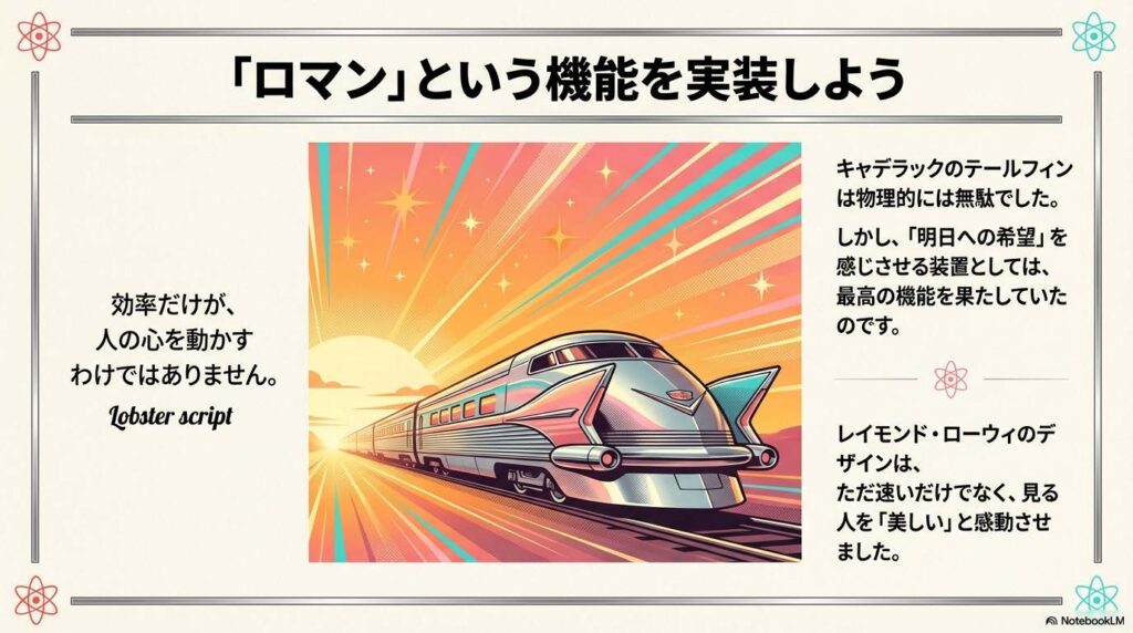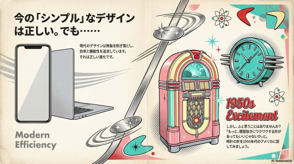 この記事では、そんな熱量にあふれた「50年代の流線型デザイン」の世界を紐解きます。 効率を度外視してでも夢を形にした、あの時代の愛すべき「無駄な曲線」。 その魅力を知れば、あなたのデザインの引き出しに、新しい「勢い」が生まれるはずです。