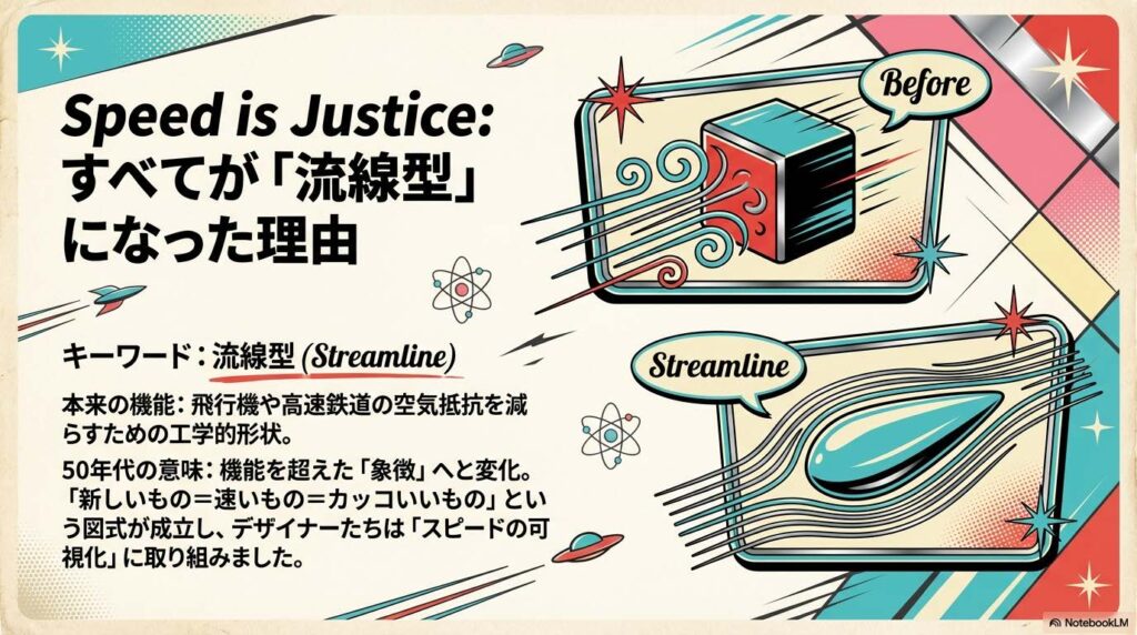 しかし、50年代のデザインにおいて、流線型は「機能」を超えて「象徴」になりました。