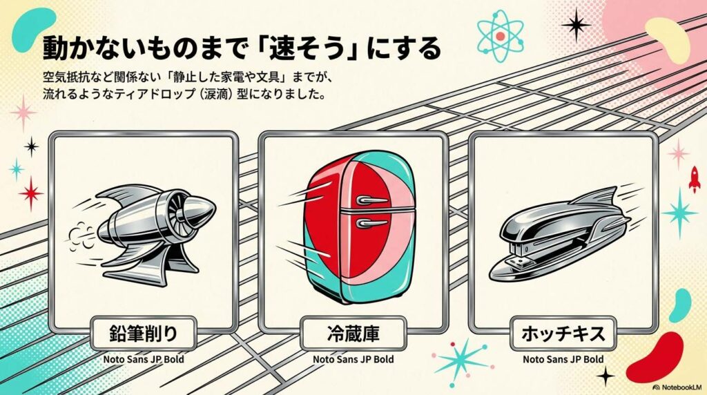 - 動かないものまで速そうにする 鉛筆削り、冷蔵庫、ホッチキス。 本来、空気抵抗など関係ない「静止した家電や文具」までが、流れるようなティアドロップ(涙滴)型になりました。