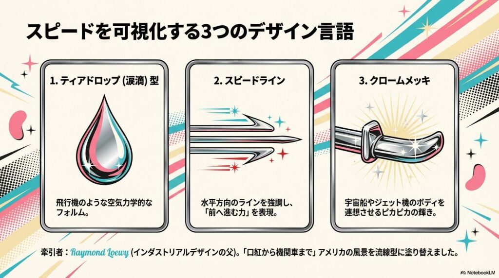 その憧れが、身近なプロダクトのデザインに直結したのです。 「新しいもの=速いもの=カッコいいもの」という図式が成立し、デザイナーたちはこぞって「スピードの可視化」に取り組みました。