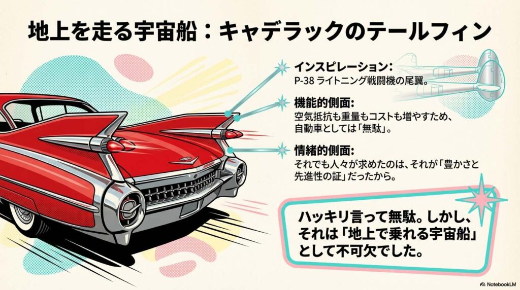 キャデラックのテールフィンは、物理的には無駄でした。 けれど、「明日への希望」を感じさせる装置としては、最高の機能を果たしていたのです。