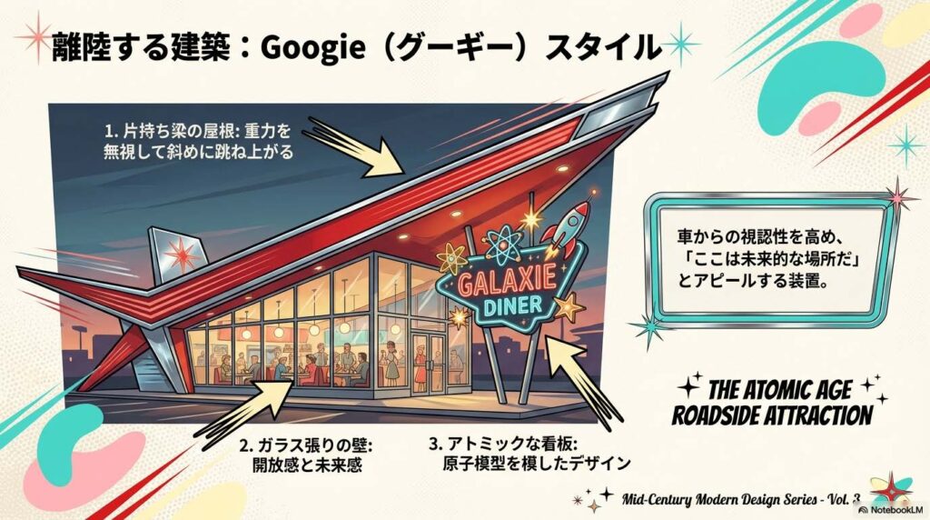街中には「グーギー建築」と呼ばれるスタイルが溢れました。 カフェやダイナー、ガソリンスタンドの屋根が、まるで離陸するように斜めに跳ね上がっているデザインです。