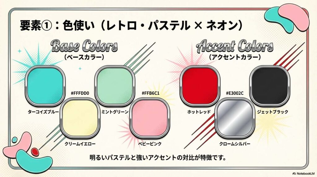 ① 色使い(レトロ・パステル × ネオン)