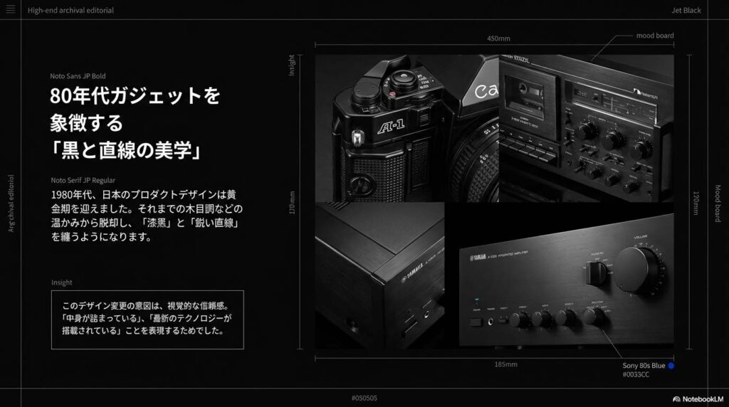 1980年代、日本のプロダクトデザインが迎えた「漆黒と直線」への転換は、単なる表面的な流行を超えた、極めて戦略的な変化でした。