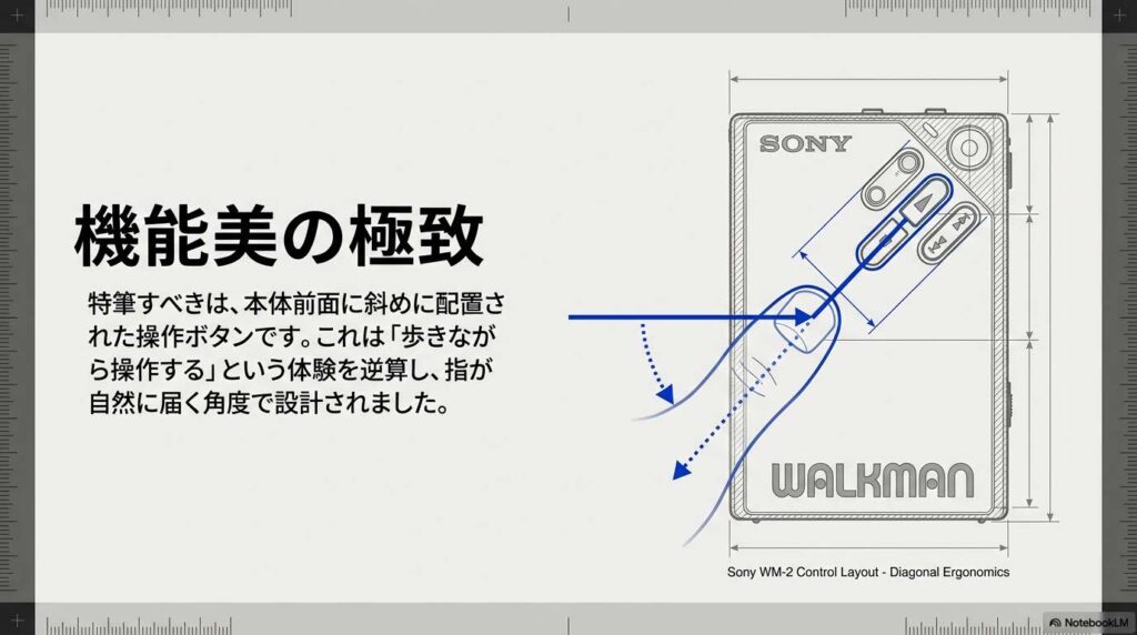 特筆すべきは、本体前面にダイナミックに配置された斜めの操作ボタンです。これは視覚的なインパクトを狙ったものではなく、ユーザーのUX(ユーザー体験)を徹底的に計算した結果でした。