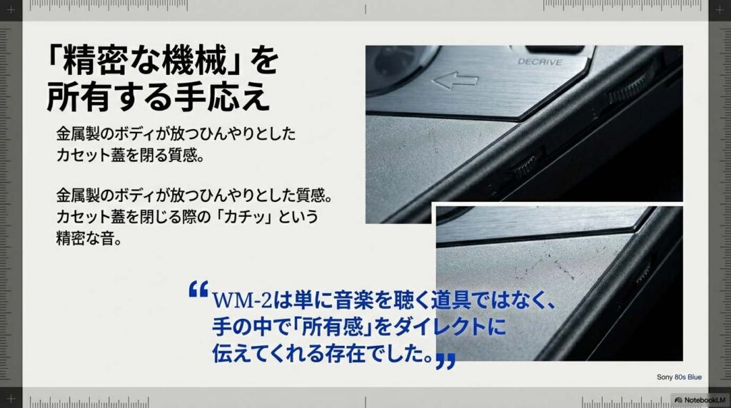 WM-2は単に音楽を聴く道具ではなく、手の中で「精密な機械を所有している」という手応えをダイレクトに伝えてくれる存在でした。