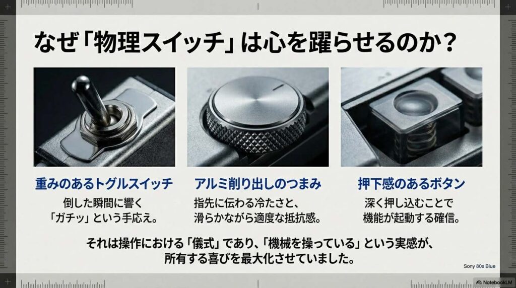 この「カチッ」という確信に満ちた音と感触こそが、ユーザーに「機械を完全に統制下においている」という心理的充足感をもたらしていたのです。
