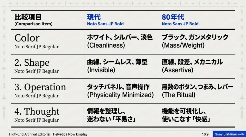 現代と80年代、それぞれの設計思想が目指した地平を比較すると、私たちが何を手にし、何を失ったのかが浮き彫りになります。