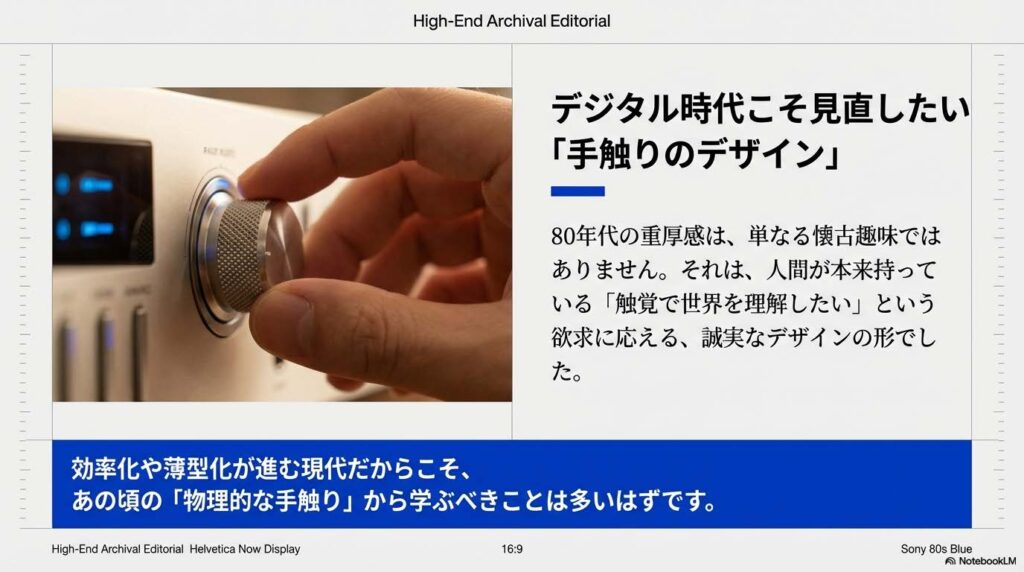 本稿では、デジタルが忘れ去った「手触り」の正体と、かつてのプロダクトがなぜ私たちの心を掴んで離さないのか、その意図されたデザインの深層を探ります。