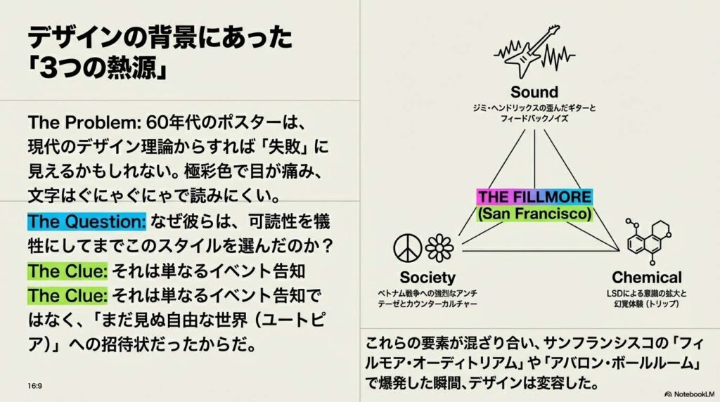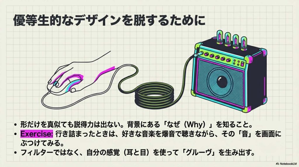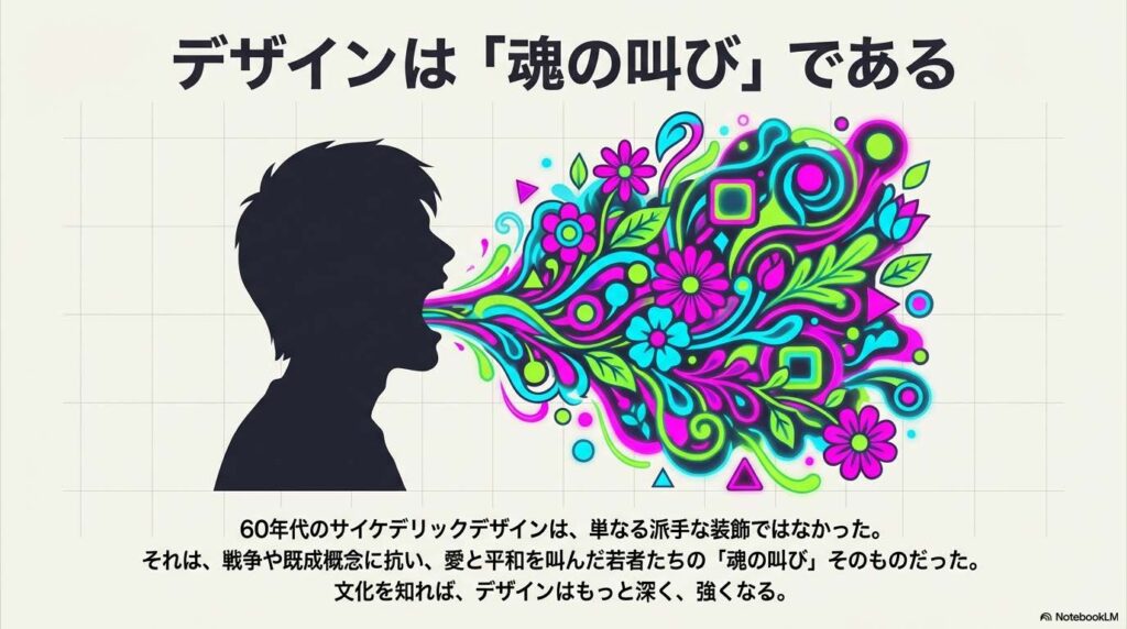 形だけを真似るのではなく、その背景にある「なぜそうなったのか(音楽との融合、意識の拡大)」を知ることで、デザインの説得力は変わります。