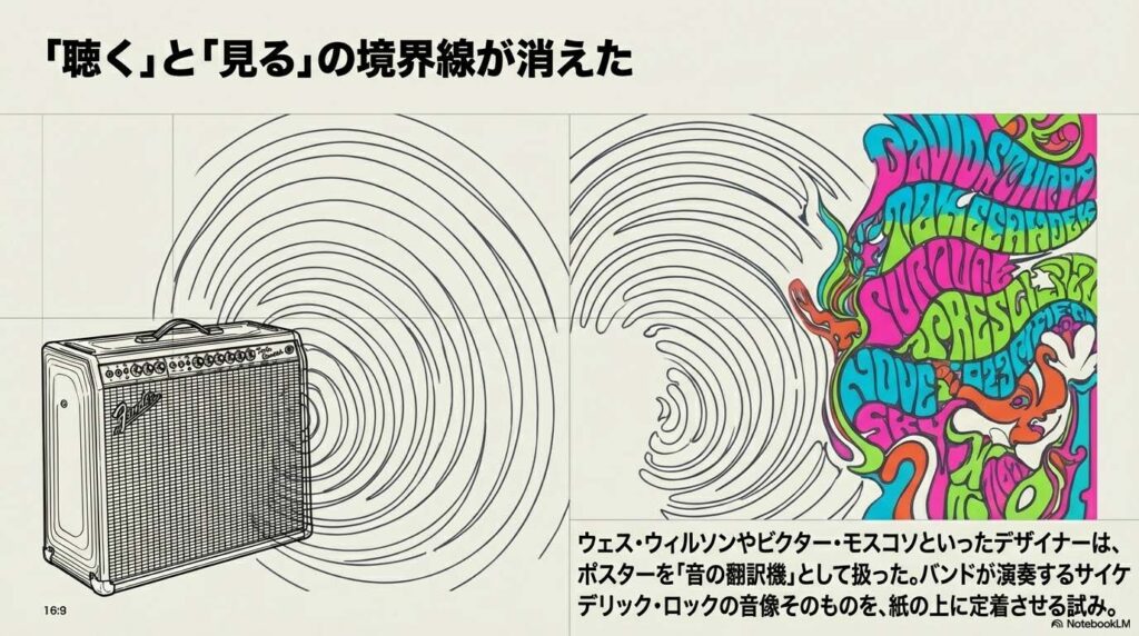 当時のライブハウス「フィルモア・オーディトリアム」や「アバロン・ボールルーム」のポスターを手掛けたデザイナー(ウェス・ウィルソンやビクター・モスコソら)は、バンドの演奏する「サイケデリック・ロック」の音像をそのまま紙に定着させようとしました。