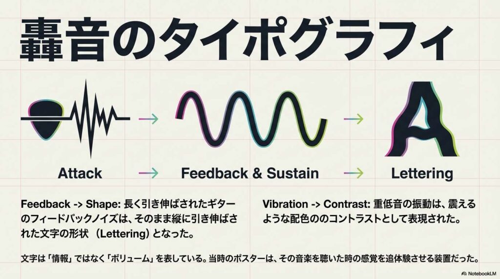 長く引き伸ばされたギターのフィードバックノイズは、そのまま引き伸ばされた文字の形になり、重低音の振動は、震えるような配色のコントラストとして表現されました。 つまり、当時のポスターは情報を伝える媒体ではなく、「その音楽を聴いた時の感覚」を追体験させる装置だったのです。