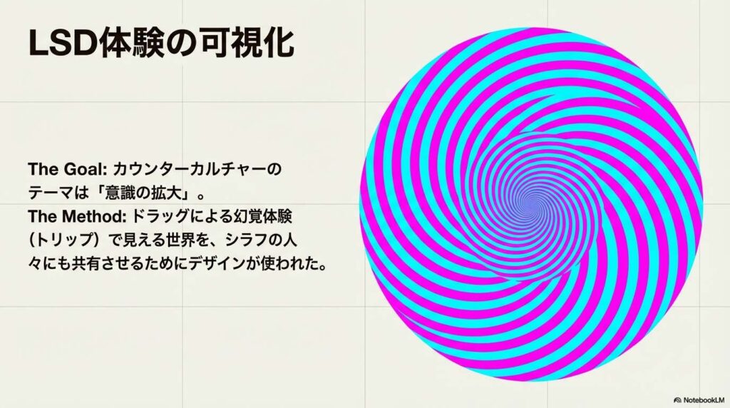 この時代のデザインを語る上で避けて通れないのが、幻覚剤(LSD)の影響です。 当時のカウンターカルチャーは、「意識の拡大」をテーマにしていました。ドラッグによる幻覚体験(トリップ)で見える世界を、シラフの人々にも共有しようとしたのです。