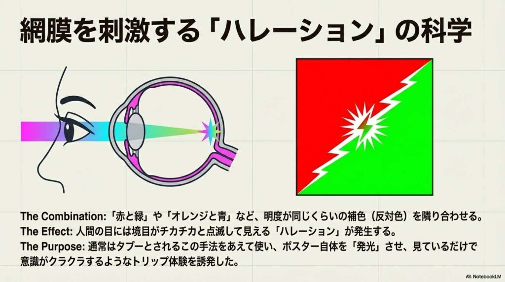 しかし彼らは、ポスター自体を「発光」させ、見ているだけで意識がクラクラするようなトリップ体験を与えるために、あえてこのタブーを標準テクニックとして採用しました。