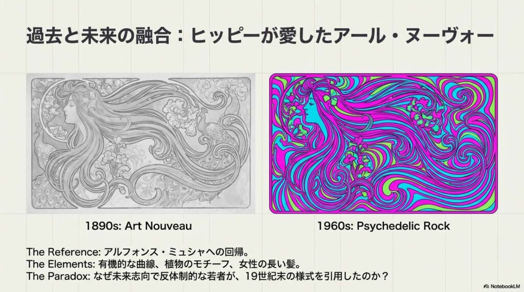 興味深いのは、未来志向で反体制的なヒッピーたちが、デザインのモチーフとして19世紀末の「アール・ヌーヴォー」を引用したことです。