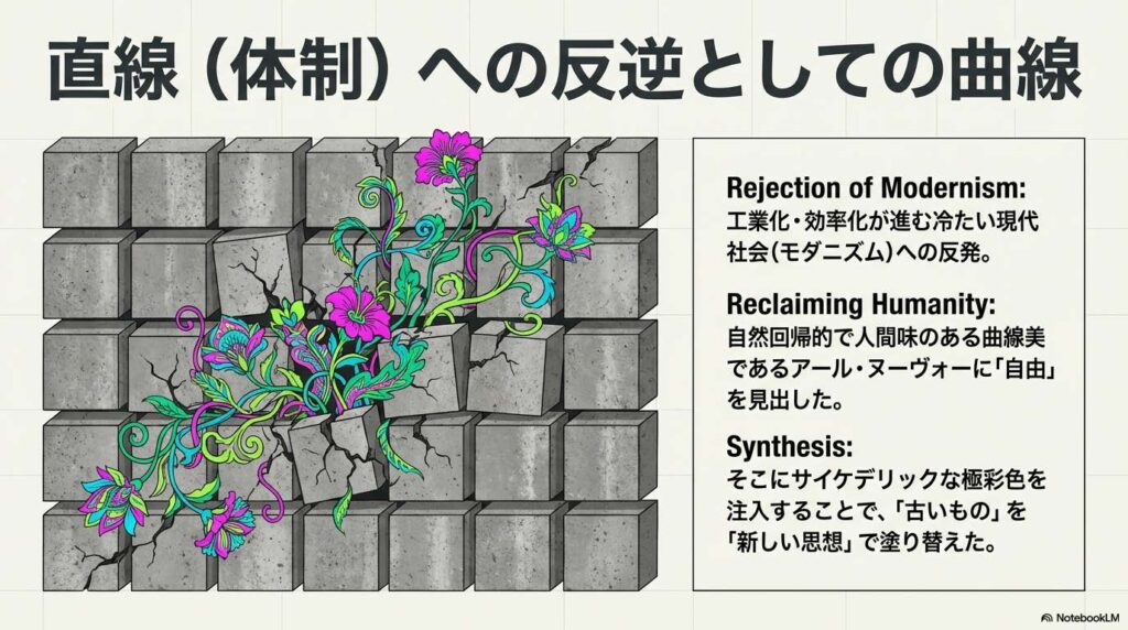 工業化・効率化が進む冷たい現代社会(モダニズム)への反発として、自然回帰的で人間味のある曲線美であるアール・ヌーヴォーを再評価し、そこにサイケデリックな極彩色を注入したのです。