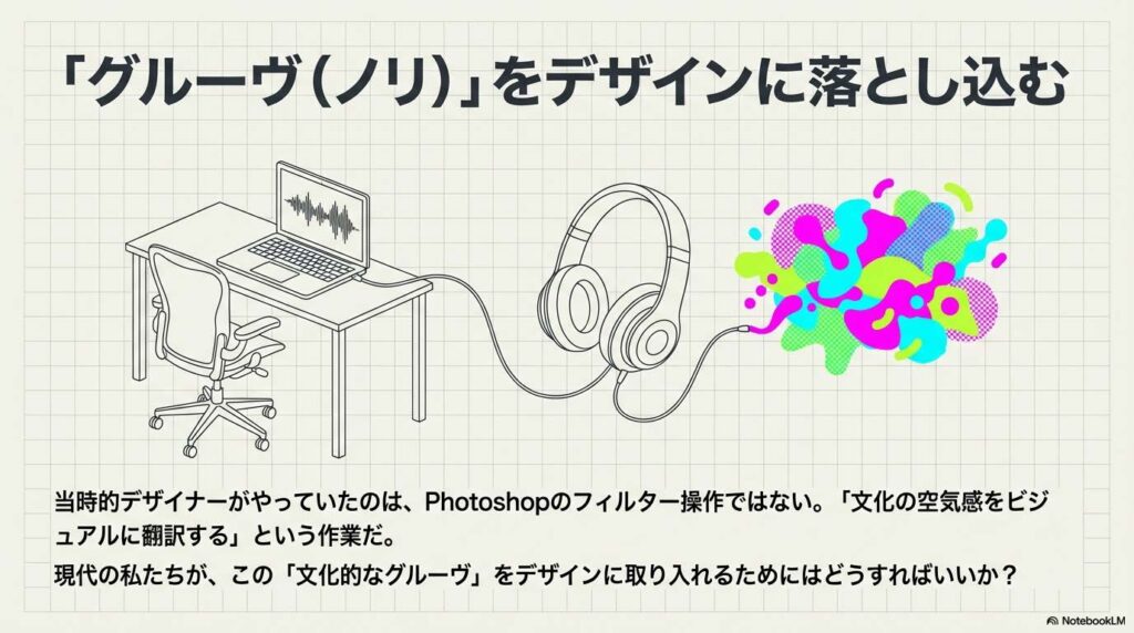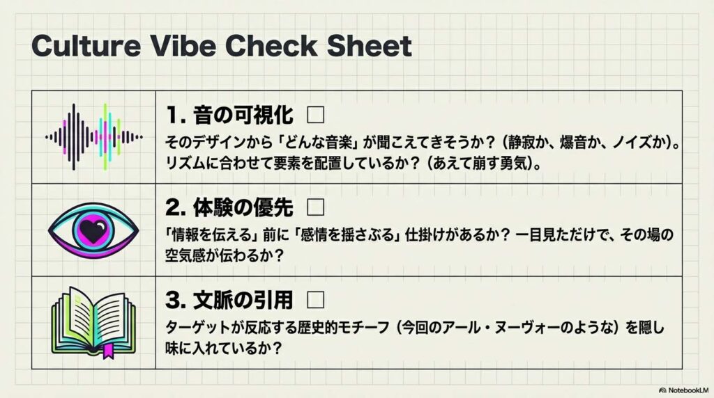 当時のデザイナーがやっていたのは、Photoshopのフィルター操作ではありません。「文化の空気感をビジュアルに翻訳する」という編集作業です。 現代のデザイン制作において、この「文化的なグルーヴ」を取り入れるためのチェックポイントを整理します。