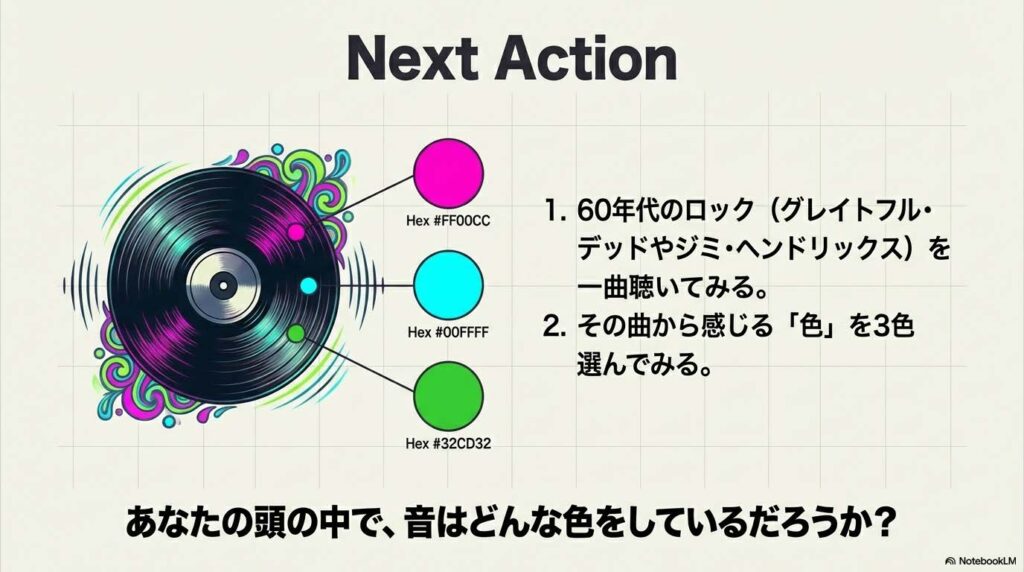 機会があれば、60年代のロック(グレイトフル・デッドやジミ・ヘンドリックス)を一曲聴き、その曲から感じる「色」を3色選んでみてください。