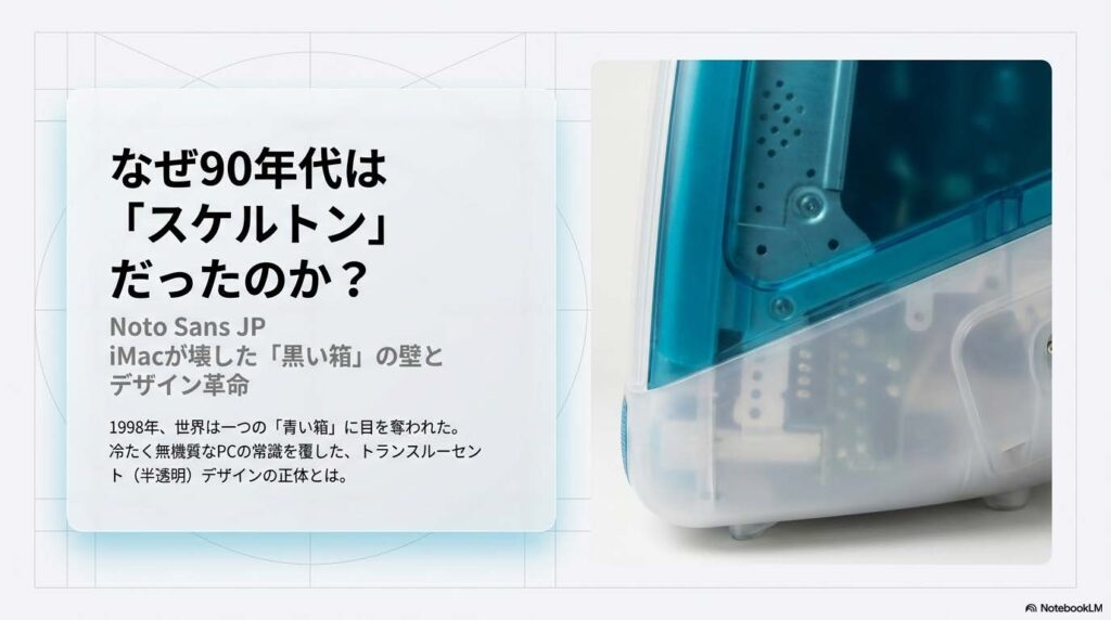 この記事では、デザイン初学者の方に向けて、90年代を席巻したスケルトンデザインの正体を解説します。「中身を見せる」という手法が、いかにして人々の心を掴んだのか。そのロジックを知れば、現代のデザインにも通じる「信頼の作り方」が見えてきます。