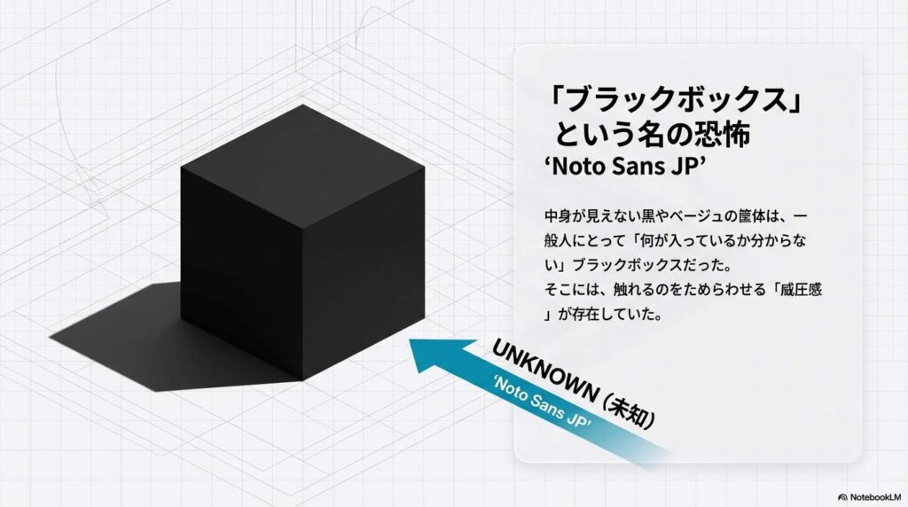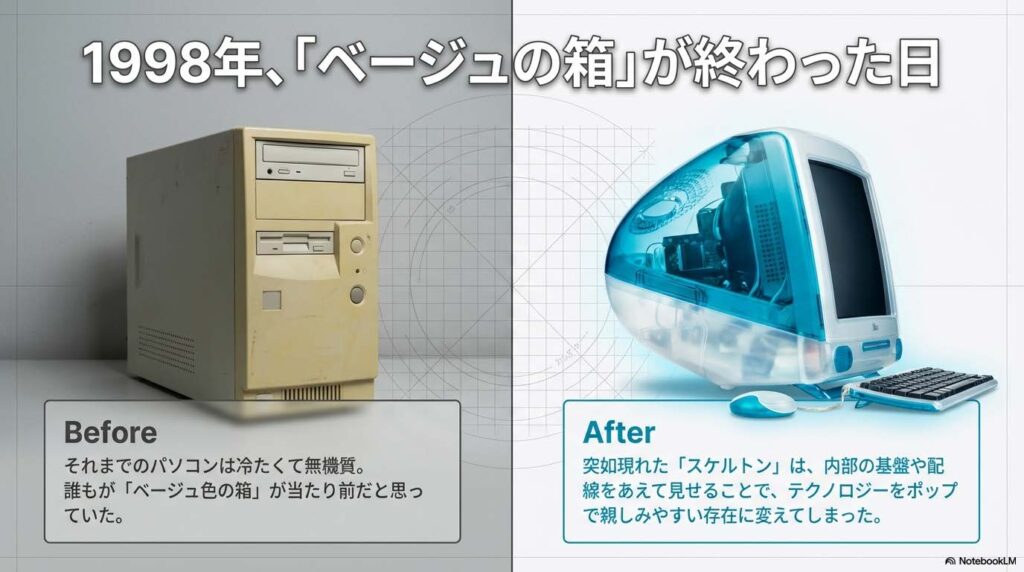 それまで、パソコンや高度な電子機器は「専門家が使う難しい機械」でした。中身が見えない黒やベージュの筐体は、一般人にとって「何が入っているか分からないブラックボックス(黒い箱)」であり、触れるのをためらわせる威圧感がありました。