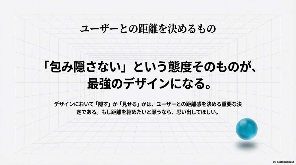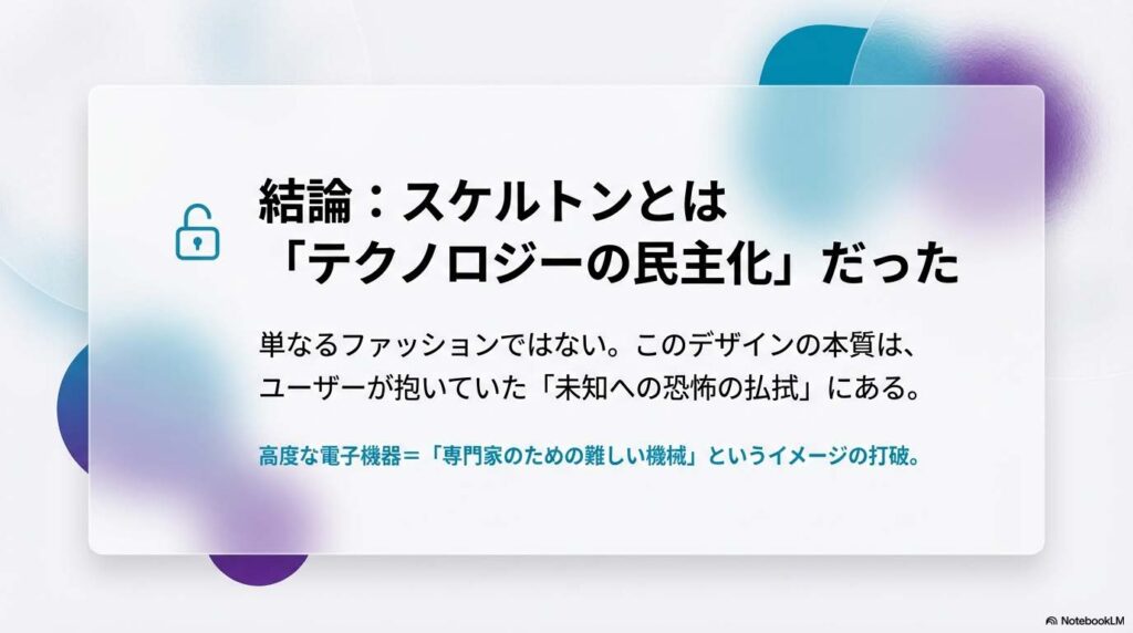 デザインにおいて「隠す」か「見せる」かは、ユーザーとの距離感を決める重要な決定です。 もしあなたが「ユーザーとの距離を縮めたい」と思った時は、この90年代のスケルトン革命を思い出してみてください。 「包み隠さない」という態度そのものが、最強のデザインになることがあります。