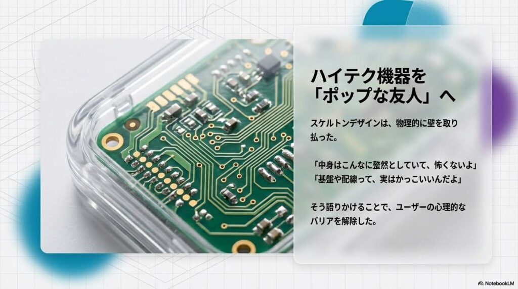 スケルトンデザインは、その壁を物理的に取っ払いました。 「中身はこんなに整然としていて、怖くないよ」 「基盤や配線って、実はかっこいいんだよ」 そう語りかけるように内部をさらけ出すことで、ハイテク機器を**「ポップな友人」**へと変えたのです。