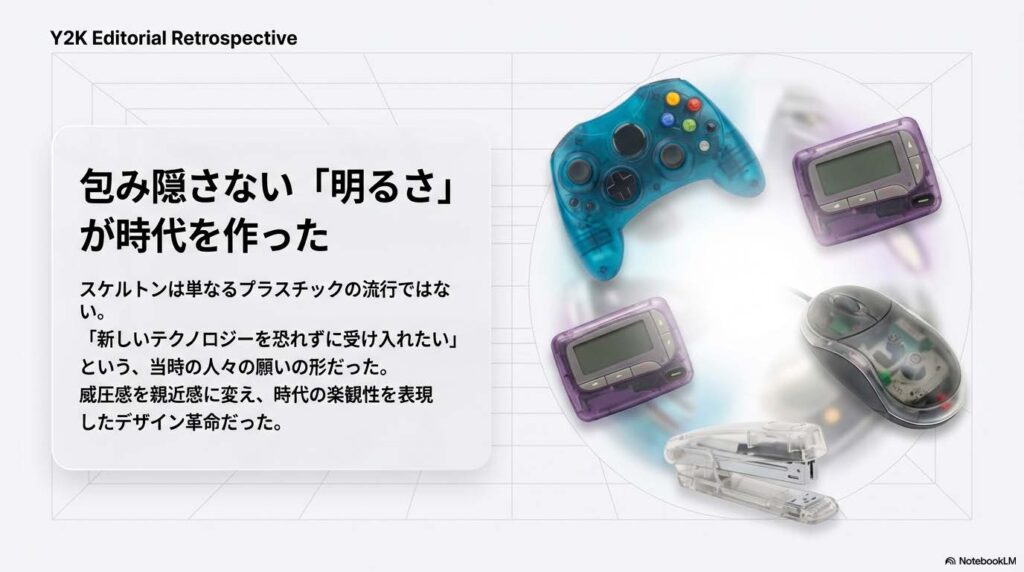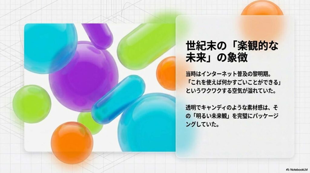 当時は世紀末。インターネットが家庭に普及し始め、「これを使えば何かすごいことができる」という楽観的な未来観が溢れていました。 あの透明でキャンディのような素材感は、そんな時代の「ワクワクする空気」を完璧にパッケージングしていたのです。