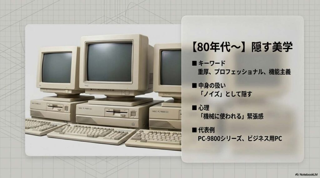 - 代表例: 往年のPC-9800シリーズ、ビジネス用PC