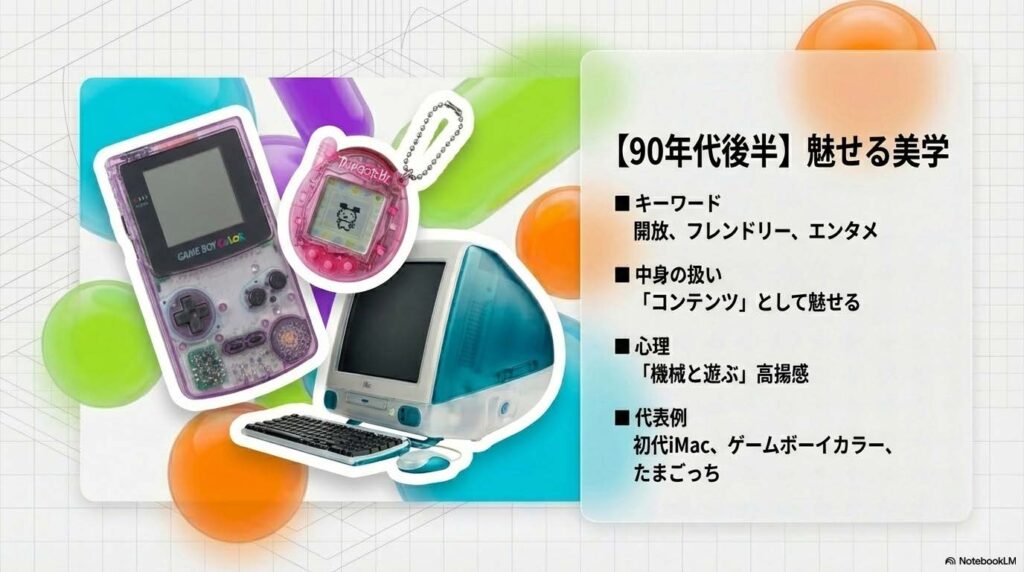 - 代表例: 初代iMac、ゲームボーイカラー、たまごっち