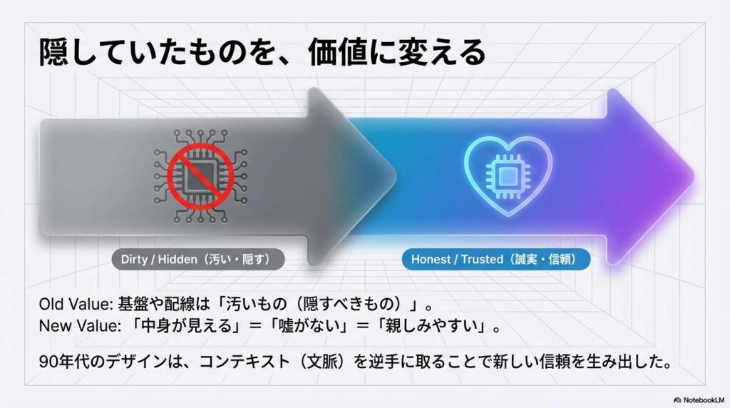 80年代まで「基盤や配線は汚いもの(隠すべきもの)」でした。 しかし90年代のデザインは、それを逆手に取りました。「中身が見える=嘘がない=親しみやすい」という新しい価値観(コンテキスト)を提示したのです。