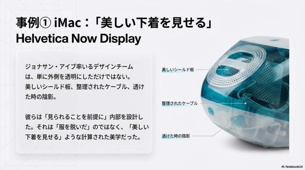 ジョナサン・アイブ率いるAppleのデザインチームは、単に外側を透明にしただけではありません。 彼らは**「見られることを前提に」内部を設計**しました。 美しいシールド板を配置し、ケーブルの取り回しを整理し、透けた時の陰影まで計算しています。これは「服を脱いだ」のではなく、「美しい下着を見せた」に近い感覚です。
