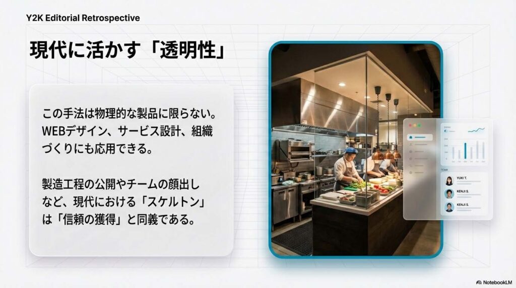 この「中身を見せる」という手法は、物理的な製品だけでなく、WEBデザインやサービス設計にも応用できます(例:製造工程の公開、チームの顔出しなど)。