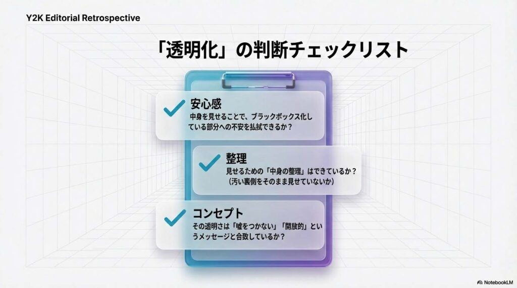 あなたのデザインや企画に「透明性」を取り入れるべきか迷った時、以下のチェックリストを使ってみてください。